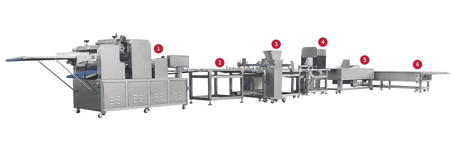 Die Produktionslinie besteht aus einer ST-868-600-Gebäckbrotformmaschine, einer Vierkanal-Shunting-Maschine, einer Vierkanal-Mehl-Rollmaschine, einer Vierkanalkonzentrationsmaschine, der CT-QT450 Doppelservo gedämpften Brotschneidtabelle und CT-WP500 Horizontaler Plattenanordnung (Modell 500).